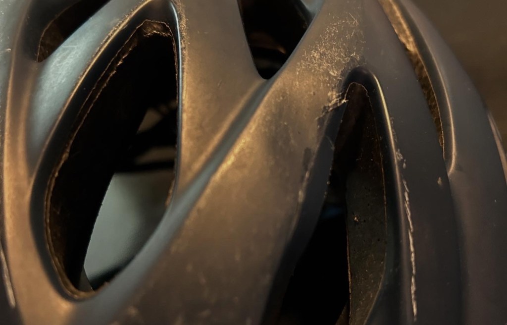 - (Photo of my dented and scratched helmet):